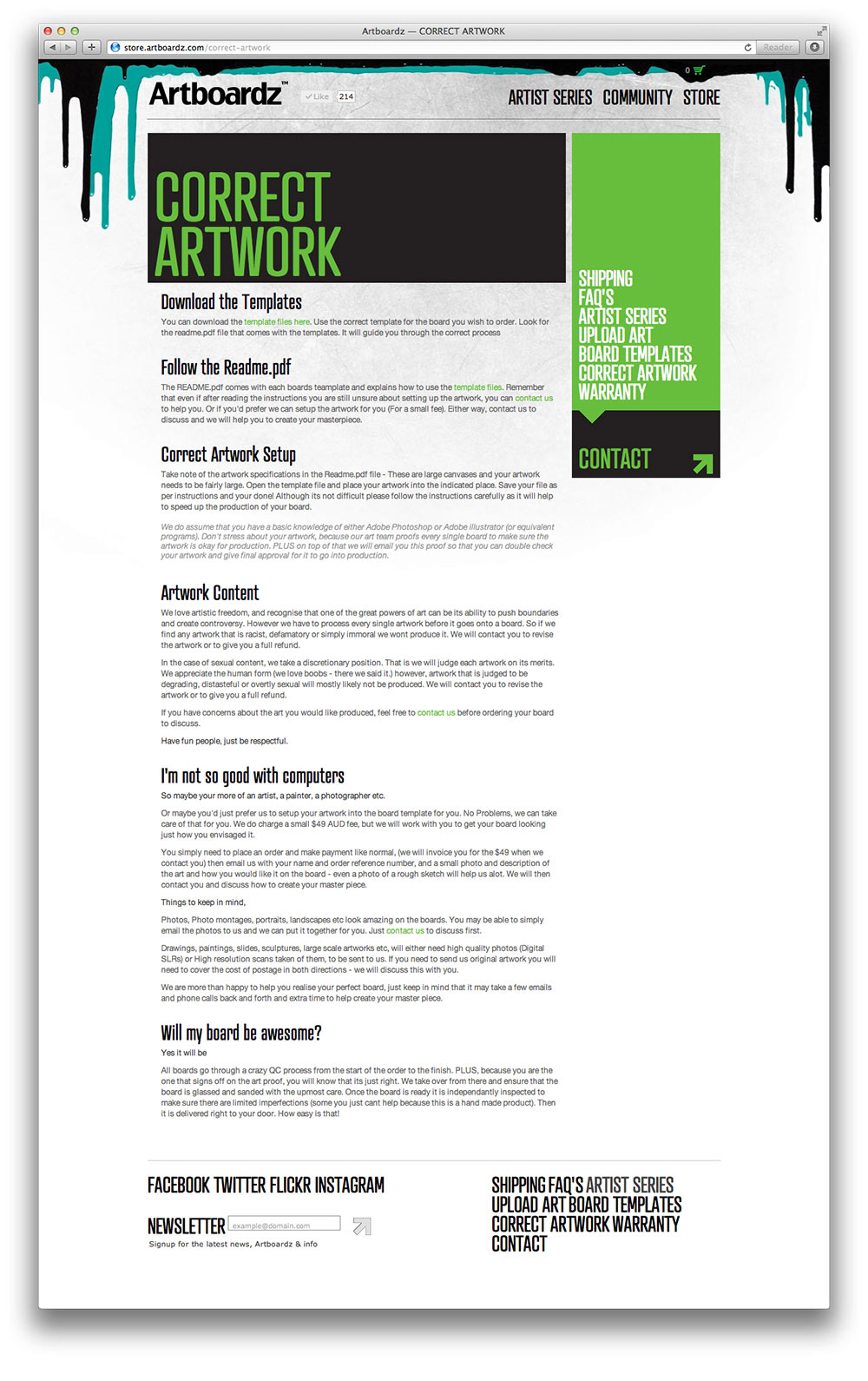 The critical and essential point of contact for the business. I built a fully customised store front on the indie ecommerce platform Big Cartel. The website featured the Artist program as well as blanks ready for your art. Matched to this was a custom form and storage system for handling the large file sizes required. To compliment this an extensive array of tutorials and help pages to give customers everything they needed.