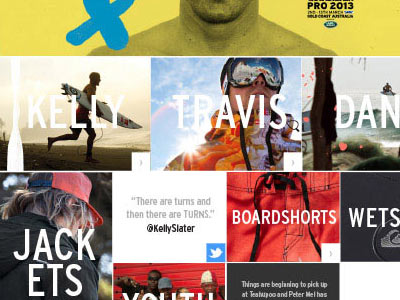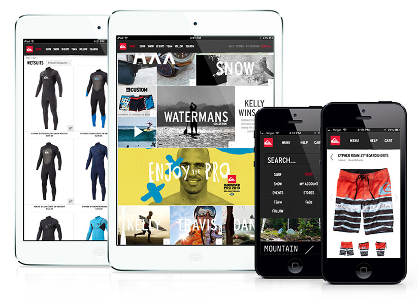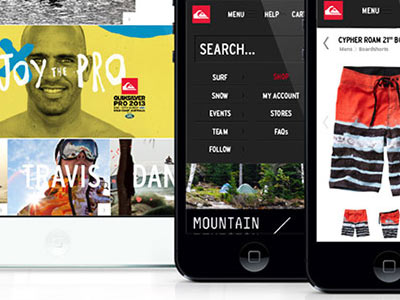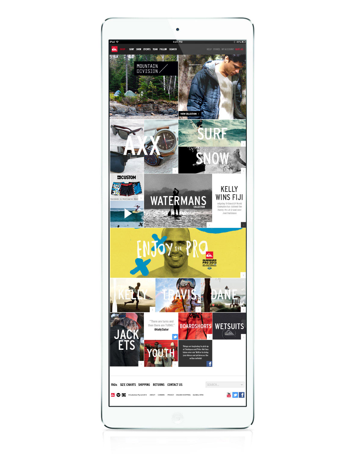 For Quiksilver, visual engagement and story telling is priority. The homepage was designed as a showcase of the best of the companies offering at an given period in time. Content feeds across Product, Events, Social, Blogs was aggregated into timeline and displayed totally integrated. Strong use of full screen of all devices with scaling content was used to provide an immersive presence.