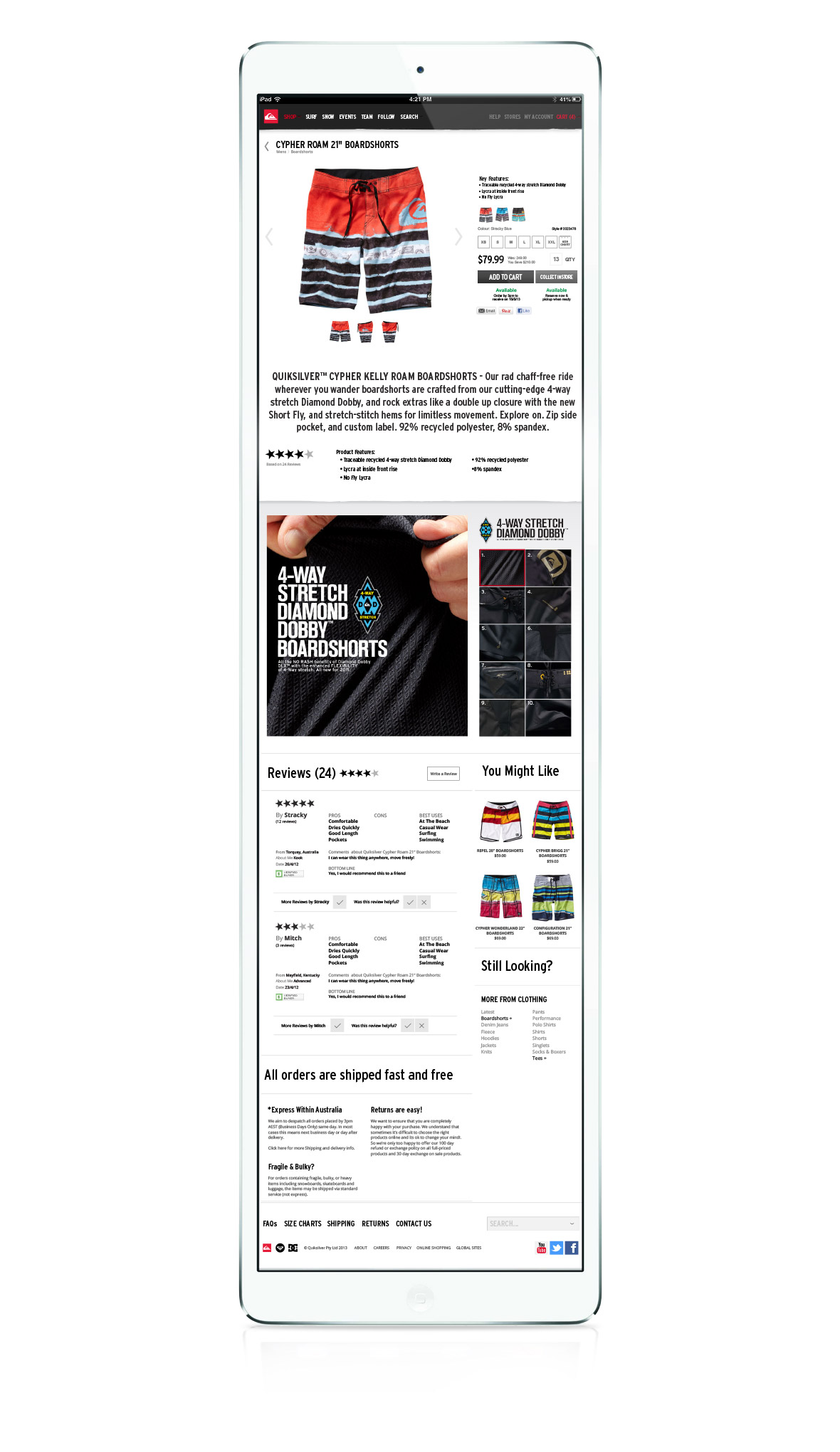 Once into the discovery journey, Quiksilver's, customers were found to shop heavily by image, resorting to navigation and facets only when required. Thus using those devices in an "accessible when required" method allowed the product to become the hero and for a unique category page format to be developed. Creating a beautiful yet functional cross device shopping experience.